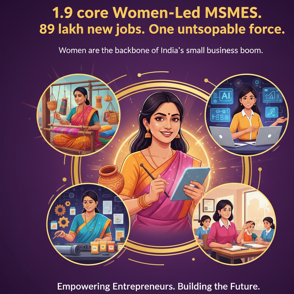 Rural and women-led micro-enterprises have become essential in small towns and villages. A World Bank feature shows that women-run rural businesses employ 22 to 27 million people in India. These are often family businesses or self-help groups—think of women making bangles, spices, or garments from home. Meanwhile, official data reveal a significant increase in women entrepreneurs: the number of women-led MSMEs nearly doubled, growing from around 1.0 to 1.92 crore between 2010 and 2024. This growth created roughly 89 lakh new jobs for women in just FY2021 to FY2023. Programs like PM Mudra Yojana, which allocated 68% of loans to women, and Startup India, where 50% of new DPIIT-recognised startups have a woman director, aim to maintain this trend. In this way, MSMEs are not only providing jobs in rural areas but also expanding opportunities for female entrepreneurs, improving financial inclusion and household incomes.