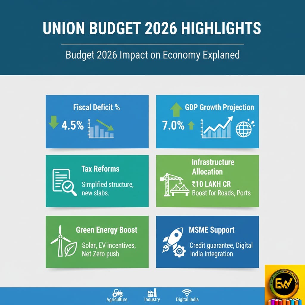 The Union Budget 2026-27 was presented on Feb 1, 2026. Continued the government’s multi-year plan for growth-driven. by capital expenditure, fiscal responsibility, and structural reforms. It sets a spending target of ₹53.47 lakh crore, which is an increase of about 7.5% from the previous year. Capital investment is set at ₹12.22 lakh crore, reflecting a roughly 9% increase. Total non-debt receipts are estimated at ₹36.5 lakh crore. Which will finance a fiscal deficit of 4.3% of GDP, meeting the medium-term goal. Growth is expected to be strong, around 6.5% to 7%, while inflation. Which was under 3% in January 2026, remains low. Overall, Budget 2026 seeks to maintain India’s growth momentum through increased spending on infrastructure and technology while gradually reducing deficits.